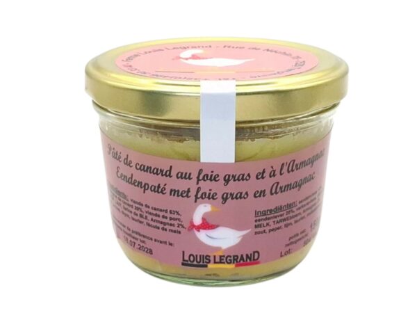 Viande de canard 36%, foie gras de canard 20%, viande de porc, oeuf, lait, farine, armagnac, sel, poivre, amidon (froment).